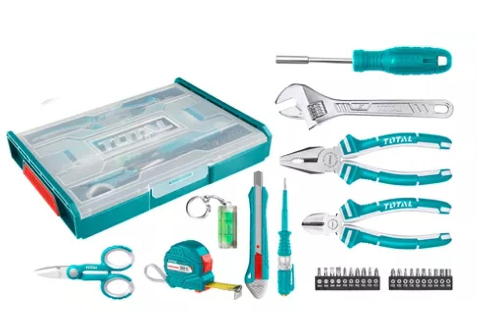 Set de herramientas marca TOTAL, 29 piezas de alta calidad en una gaveta plastica